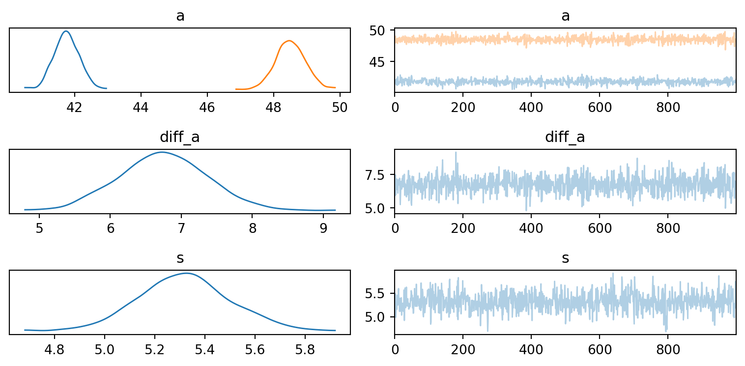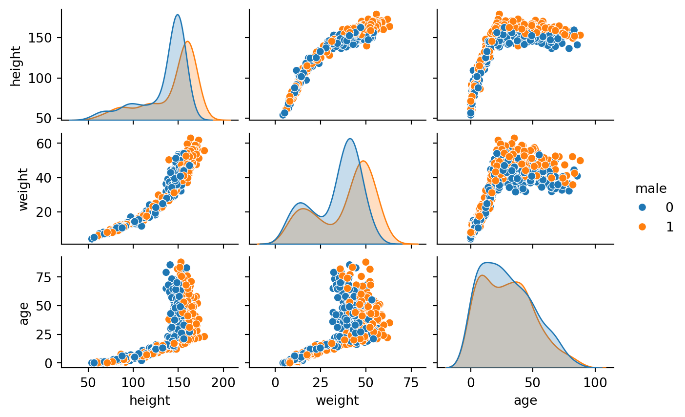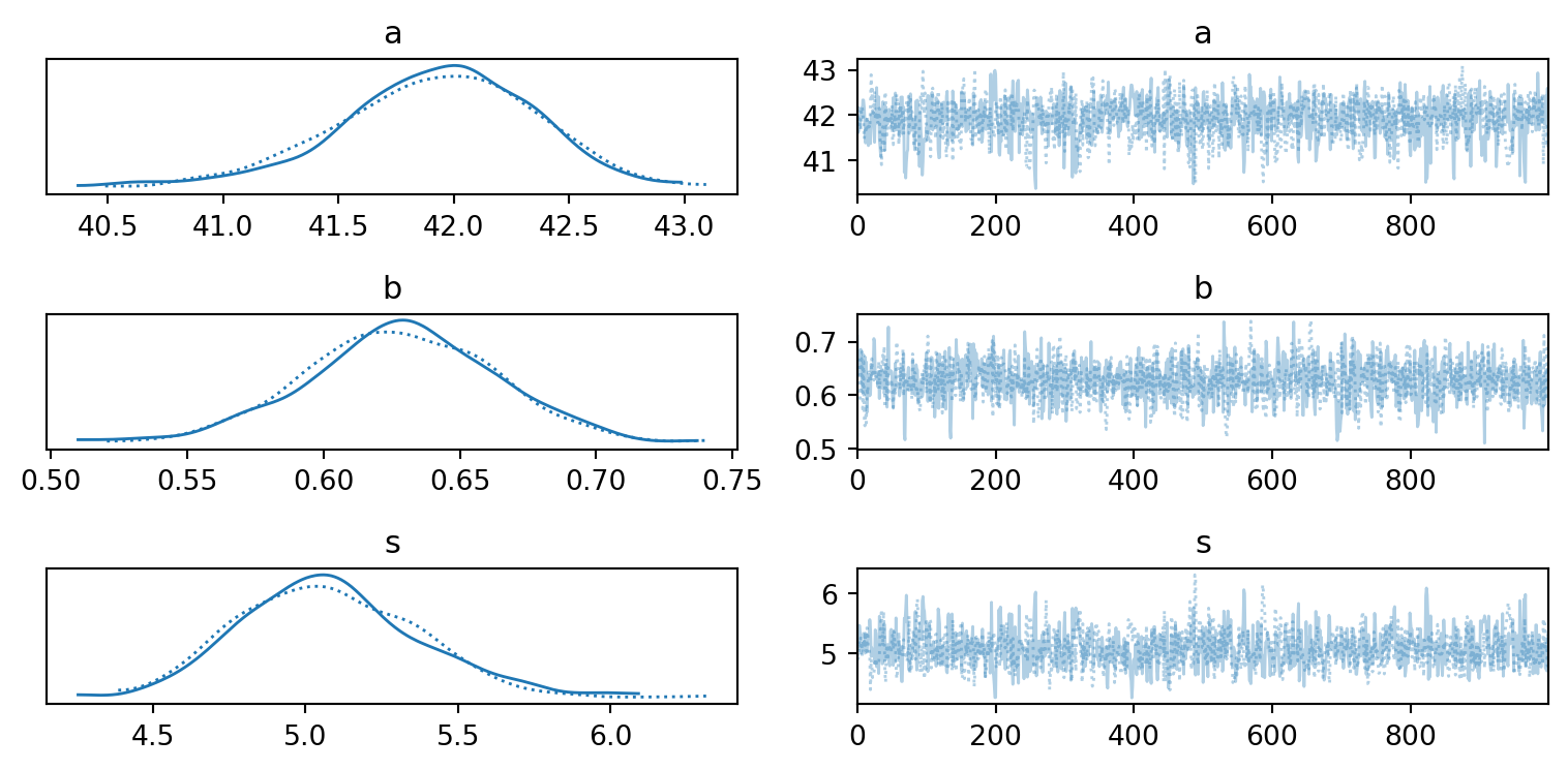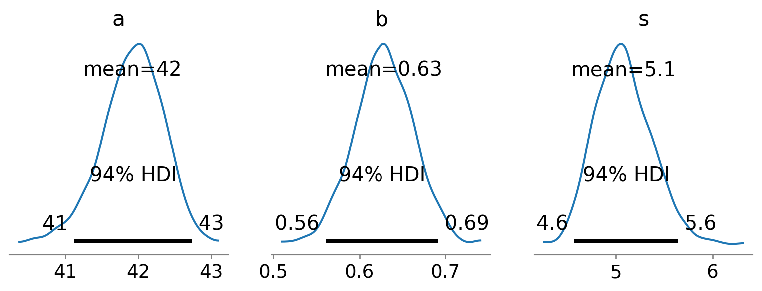 # This time with all the datadf_howell1["height_c"] = center(df_howell1.height)dat3 = {"height" : df_howell1.height_c.values,"weight" : df_howell1.weight.values}# Define the modeldef mdl3a(height, weight=None):# Define prior a = numpyro.sample('a', dist.Normal(0, 10)) b = numpyro.sample('b', dist.Normal(0, 1)) s = numpyro.sample('s', dist.HalfNormal(1))# Define likelihood numpyro.sample("obs", dist.Normal(a+b*height, s), obs=weight)